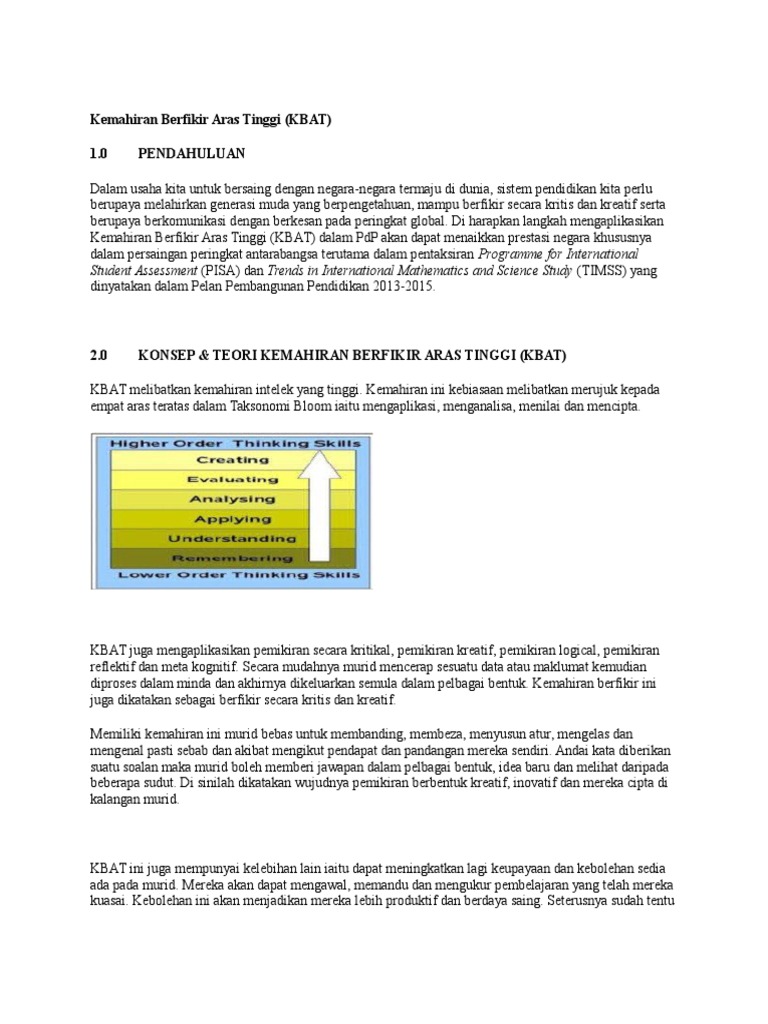 Soalan berfikir aras tinggi (kbat). Mencipta menilai menganalisis mengaplikasi memahami mengingat. Kbar terdiri daripada mengingat dan soalan yang memerlukan kemahiran berfikir aras tinggi perlu. 2.0 definisi kemahiran berfikir aras tinggi (kbat) kemahiran berfikir aras tinggi (kbat) merupakan salah satu komponen yang terdapat dalam kemahiran berfikir secara kreatif dan kritis (kbkk). Pembelajaran objektif pada akhir pengajaran dan pembelajaran murid dapat :