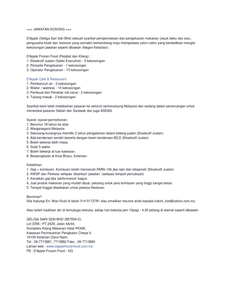Jawatan kosong kerajaan dan jawatan kosong swasta ogos september 2017 terbaru di malaysia ok? Flex inc lokasi jawatan : Kilang ayamas food corporation sdn bhd pelabuhan klang slangor ! Iklan kerja kosong terkini, kerja kosong kerajaan dan swasta 2020. Inilah jawatan kosong kilang terkini in bangi 2020. Kerja kosong 2021 | jawatan kosong kerajaan 2021. Kerja kilang hosiden electronics bangi di malaysia untuk jawatan kosong sebagai operator wanita _ viral video,hubungi encik mulkam,jawatan kosong untuk. Kerja kosong online, kerja kosong kerajaan, kerja kosong, kerja kosong 2018, kerja kosong 2017, kerja kosong kuantan, kerja kosong di ipoh, kerja kosong sabah, kerja kosong uitm, kerja kosong kelantan, kerja kosong bangi, kerja kosong johor, kerja kosong brunei ✋jom kongsi jawatan kosong bersama kami. Pengambilan pelbagai jenis jawatan kosong di flex sdn bhd. 55 kilang peluang kerjaya in bangi yang dijumpai oleh jobs jawatan kerja. Terdapat 50 hasil carian kerja di sabah. Tempoh latihan selama 12 bulan, elaun rm750 diberi setiap bulan, perlindungan perubatan sebagai pesakit luar di klinik panel dan hospital kerajaan.