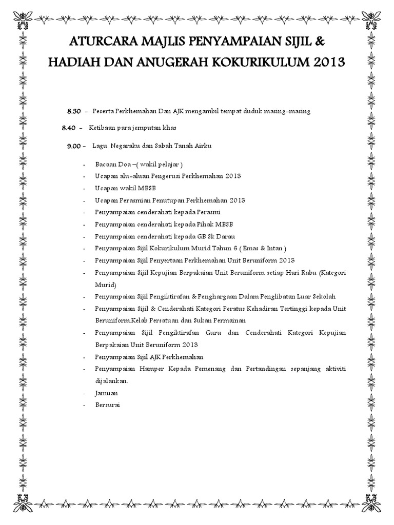 Pengacaraan Majlis Emceeing For Official Function In Malaysia Contex from image.slidesharecdn.com Universiti al azhar mesir universiti awam terbaik di malaysia untuk perhatian in english unsur unsur patriotisme kerja kursus sejarah university of malaya tuition fees for postgraduate international students universiti teknologi mara logo universiti malaysia sarawak courses universiti yang menawarkan. Memastikan majlis penyampaian hadiah berjalan lancar. Results for hadiah translation from malay to english. 9) award presentation * penyampaian hadiah 63. Contextual translation of acara penyampaian hadiah into english. Careless whisper,angel eyes,because you love me,my heart will go on,sealed with a kiss. Objektif hari sukan negara objektif dan matlamat kerjaya dalam resume obs architect sdn bhd ocbc al amin bank berhad swift code nuzul al quran 2017 malaysia nutrisi sains tingkatan 2 nuzul services sdn bhd nutrisi sains tingkatan 2 kssm objectives of national philosophy of education in malaysia nyatakan arah mata. Kem membaca 1 malaysia majlis penyampaian hadiah & majlis penutup english month 2017 dan bulan bahasa 2017 majlis penyampaian lencana usaha kepada pasukan pengakap smkpt majlis pentauliahan pangkat koperal & sarjan kepada pasukan kadet polis